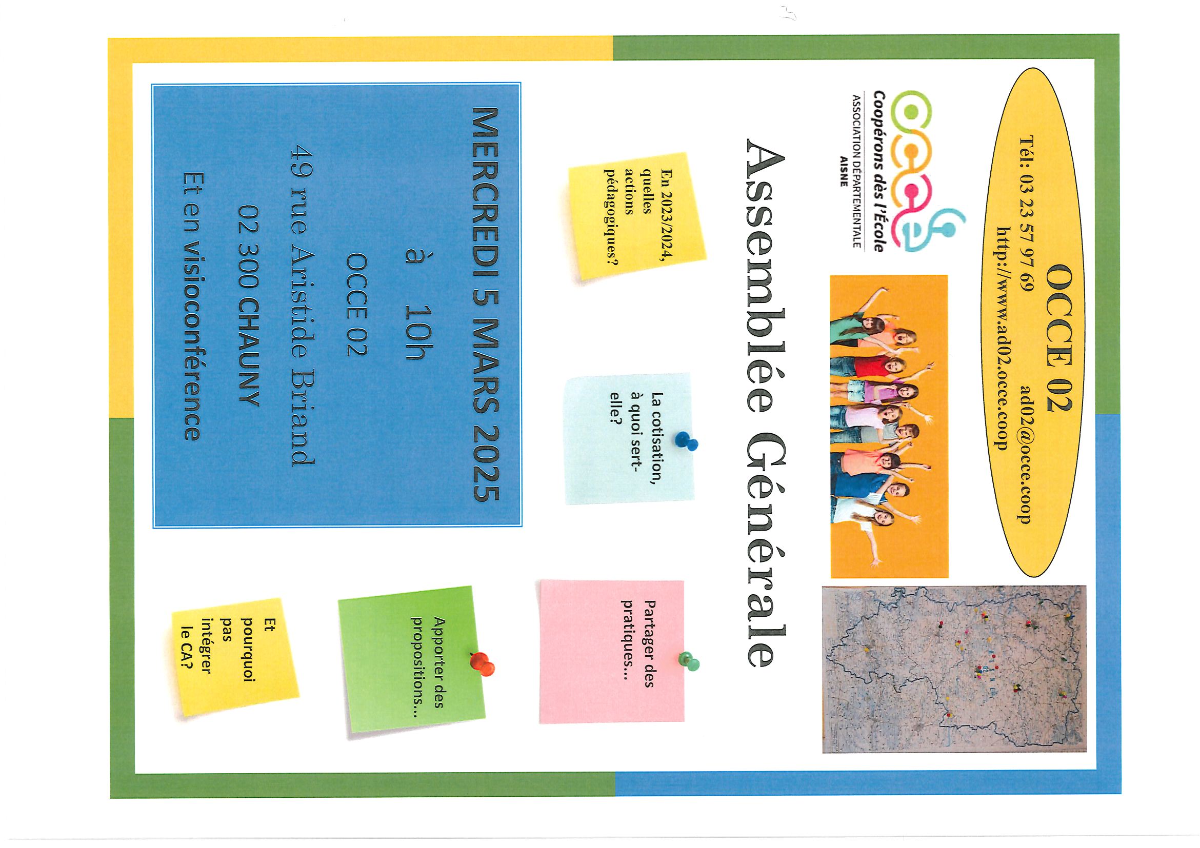 L'ASSEMBLEE GENERALE ORDINAIRE de l'OCCE 02 se tiendra , EN PRESENTIEL et EN VISIOCONFERENCE , le 5 MARS 2025 à 10h au siège de l'OCCE 02, à Chauny.